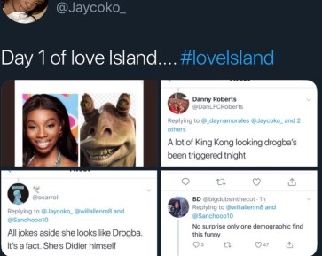 As someone who falls into the same demographic categories as these two contestants: 20-something, black, female and British; this is a difficult pill to swallow. It is hurtful to see people that look like you be so unwanted and sidelined year on year while the Lucies and the Meghans constantly gain centre stage from the moment they enter the villa. It is hard to see racist tweets resurfacing based on people who look like you no matter how many times you hit that ‘report’ button. And it is painful to think that you too are viewed this way by the society you reside in. The society you call your home. Some may claim that it is just a show, that it holds no bearing on the realities of life in Britain and should not be taken seriously. But it is hard to ignore the experiences of these women when the same story is repeated year on year on our screens.